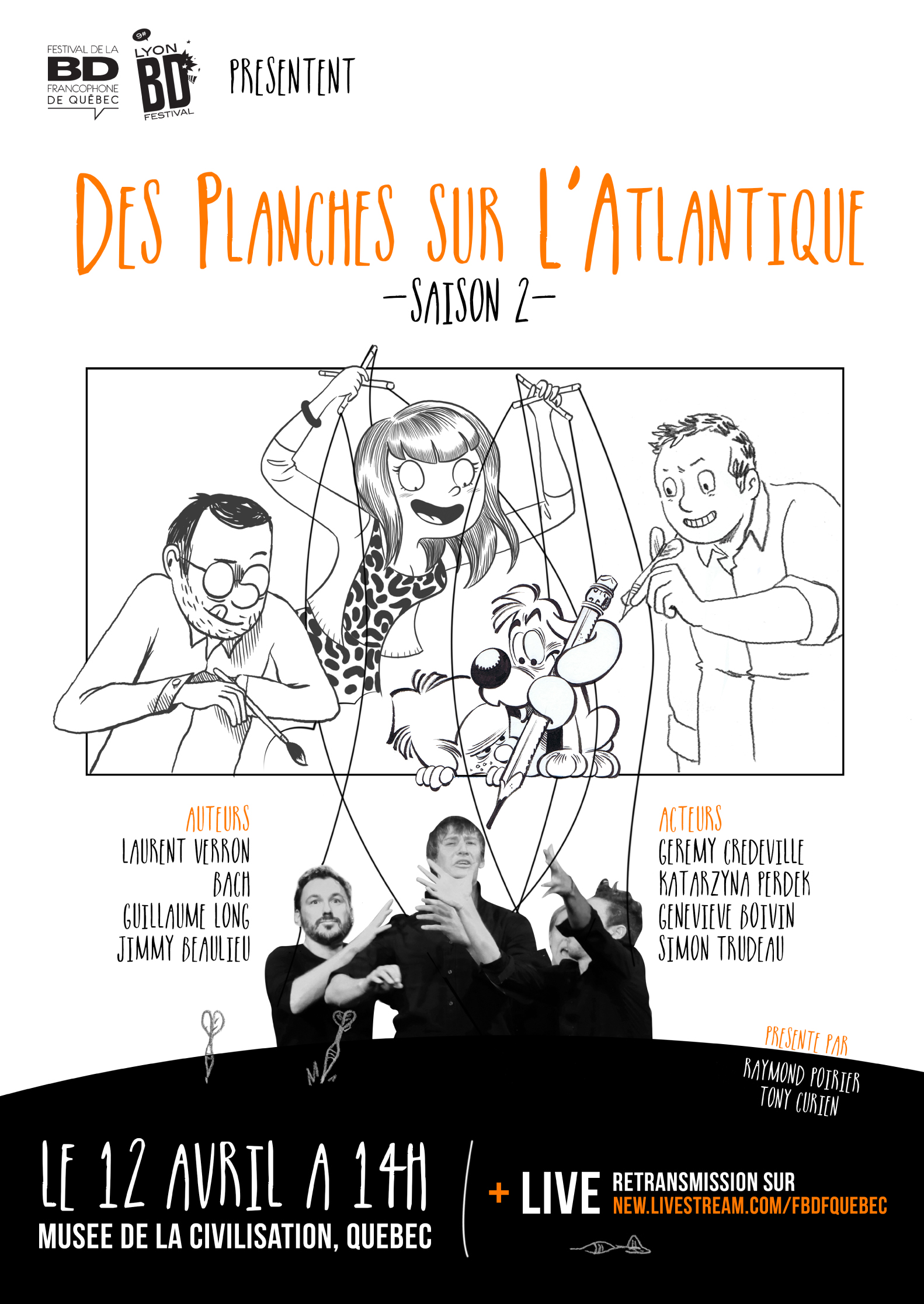 Le samedi 12 avril, à 14h, le FBDFQ et Lyon BD sont heureux de présenter pour une deuxième année un spectacle original de création de BD en direct : Des planches sur l’Atlantique. Pour l’occasion, quatre dessinateurs (Laurent Verron, Guillaume Long, Jimmy Beaulieu et Bach) et quatre comédiens (Gérémie G. Credeville, Katarzyna Perdek, Geneviève Boivin et Simon Trudeau) de Lyon et de Québec s’uniront pour créer une œuvre inédite et entièrement improvisée. Le concept : donner vie à une bande dessinée et à tous ses personnages, en dessin et sur les planches, en respectant les contraintes imposées par le public. Le tout, accompagné en musique par Frédéric Brunet et Nicolas Jobin, et mené par les animateurs Tony Curien et Raymond Poirier.