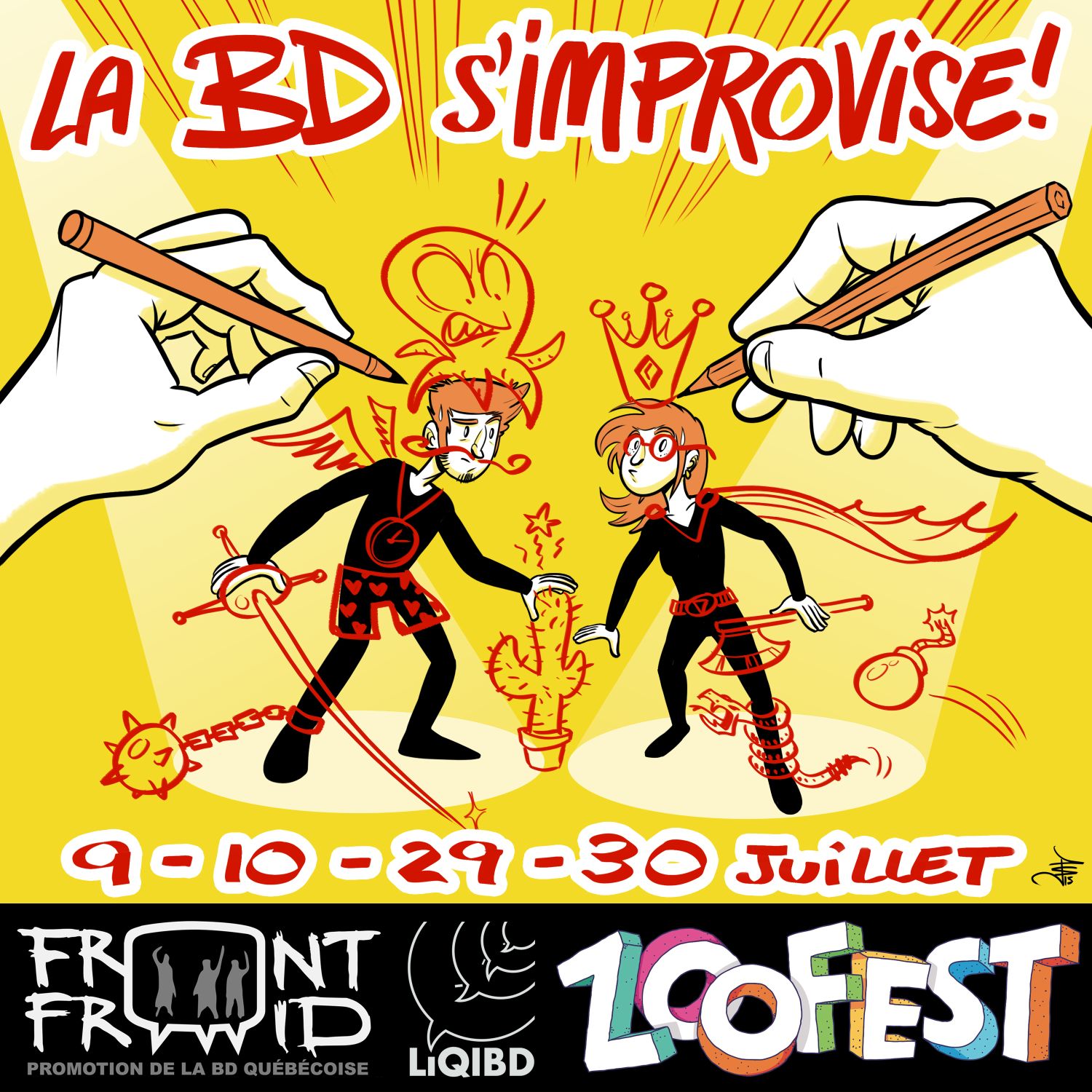 Front Froid et la Ligue québécoise d’impro BD (LiQIBD) sont heureux de vous inviter au spectacle original d’impro BD La BD s’improvise! Dans le cadre du festival Zoofest, quatre représentations auront lieu les jeudi et vendredi 9 et 10 juillet ainsi que les mercredi et jeudi 29 et 30 juillet au Théâtre La Chapelle, 3700, rue Saint-Dominique à Montréal, à compter de 19 h.