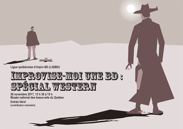 Au menu? La création en direct, et sans filets, d’un western! Pour cette troisième rencontre de la saison, parents et enfants seront solicités pour créer, en compagnie des comédiens, des dessinateurs et des musiciens de la ligue, une histoire aux couleurs de saison! Une rencontre unique à ne pas manquer.