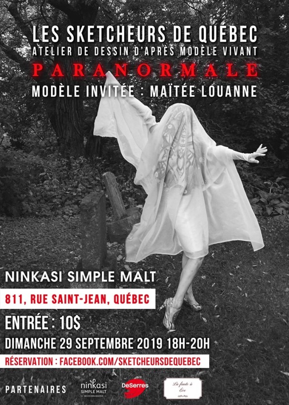 Le prochain atelier de dessin d’après modèle vivant offert par les Sketcheurs de Québec offrira performance de l’intrigante Maïtée Louanne, qui, nous dit-on, posera pour nous « depuis l’au-delà« . « Nouvellement décédée, elle passe son temps à s’inventer de nouvelles vies. Paranormale sera l’occasion de découvrir deux de ses réincarnations« , explique-t-on.
