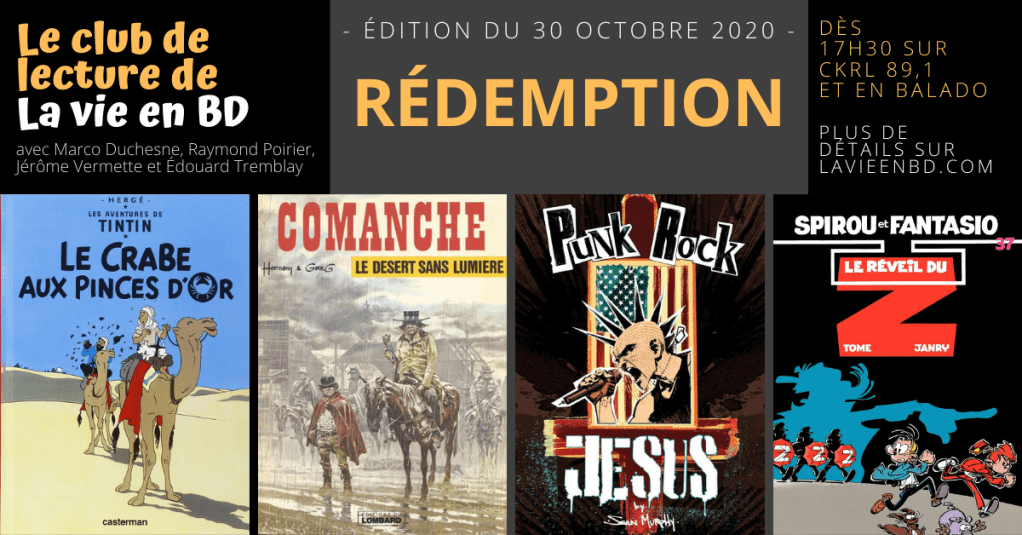 À l’invitation de Marco, le Club de lecture échangera autour de quatre ouvrages qui, chacun à leur façon, mets en avant le thème de la «rédemption» : Punk Rock Jesus, de Sean Murphy (Vertigo), Les aventures de Tintin T9 – Le crabe aux pinces d’or, de Hergé (Casterman), Les aventures de Spirou et Fantasio T37 – Le réveil du Z, de Tome et Janry (Dupuis), Comanche T5 – Le désert sans lumière, de Greg et Hermann (Le Lombard).