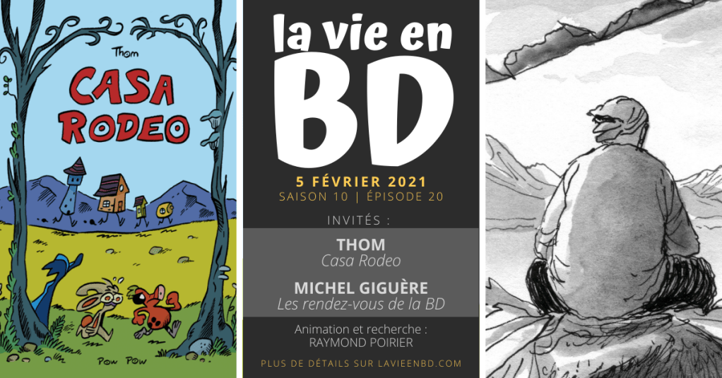 À l’occasion de l’édition du 5 février 2021 de La vie en BD, l’animateur Raymond Poirier s’entretient avec Thom autour de sa bande dessinée Casa Rodeo, publiée aux Éditions Pow Pow, au fil d’un long entretien. Également de passage : Michel Giguère, en amont d’une rencontre des Rendez-vous de la BD consacrée à ses albums coup de coeur de la dernière décennie, présentée le 10 février à la Maison de la littérature.