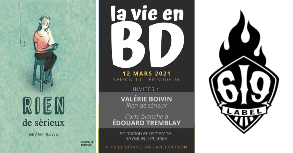 À l’occasion de l’édition du 12 mars 2021 de La vie en BD, notre animateur Raymond Poirier recevait l’autrice Valérie Boivin autour de sa bande dessinée Rien de sérieux, publiée chez Nouvelle adresse. Le libraire Édouard Tremblay se voit également offrir une chronique « carte blanche » qu’il consacre à l’histoire et l’évolution du Label 619.