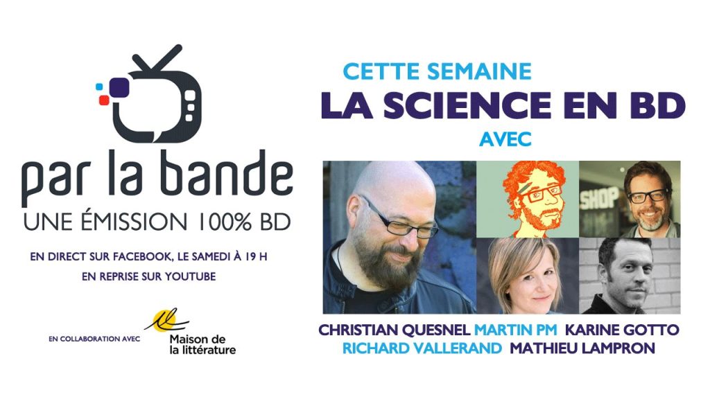 Cette semaine, pour la première de Par la bande, Raymond Poirier parle de la vulgarisation scientifique en BD, en compagnie de Christian Quesnel (Vous avez détruit la beauté du monde) et des invités Richard Vallerand (Les Laborats), Karine Gottot et Mathieu Lampron (Pause philo), ainsi que Martin PM. Aussi de passage : Marie-Hélène Vaugeois, de la Librairie Vaugeois, qui vous présente aussi ses suggestions de lecture.