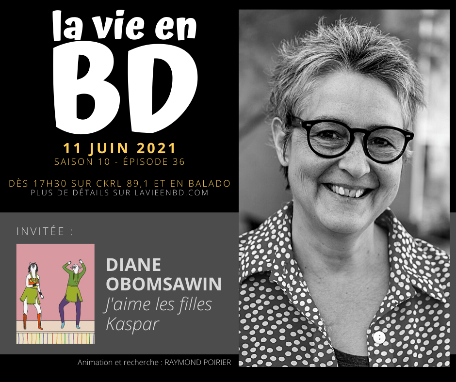 Dans le cadre de son édition du 11 juin 2021, La vie en BD et son animateur Raymond Poirier ous proposent une rencontre d’une heure en compagnie de Diane Obomsawin. Une discussion entre arts visuels, bande dessinée, illustration jeunesse et cinéma d’animation, autour des oeuvres phares de l’artiste tels que J’aime les filles ou Kaspar.