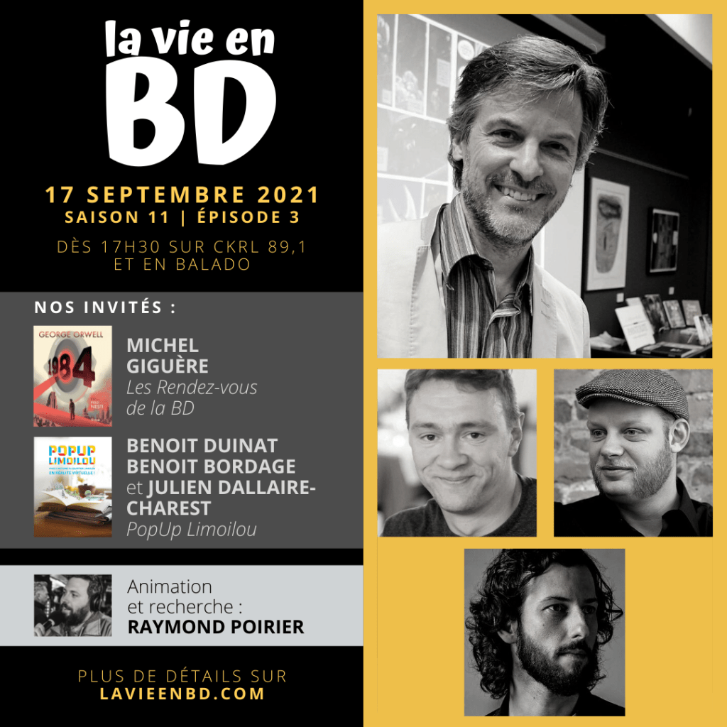 Ce vendredi 17h30 à La vie en BD, notre animateur Raymond Poirier reçoit Michel Giguère, en amont d’une rencontre bien particulier des Rendez-vous de la BD où le médiateur en bande dessinée s’affairera à comparer cinq adaptations BD du roman 1984 de George Orwell qui ont trouvé récemment leur chemin vers les tablettes des libraires.