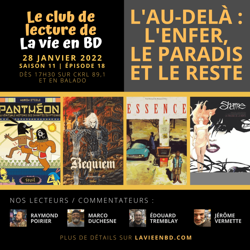 La thématique a été sélectionnée par Édouard et, nouvelle habitude pour la saison 2021-2022, chacun des collaborateurs du Club a été invité à fournir un album de son choix. La sélection du 28 janvier inclus : Requiem chevalier-vampire T1 : Résurection, d’Olivier Ledroit et Pat Mills (Glénat), Panthéon! La véritable histoire des divinités égyptiennes, d’Hamish Steele (Seuil), Essence, de Benjamin Flao et Fred Bernard (Futuropolis) et Shame : la trilogie de la honte, de Lovern Kindzierski et John Bolton (Glénat).
