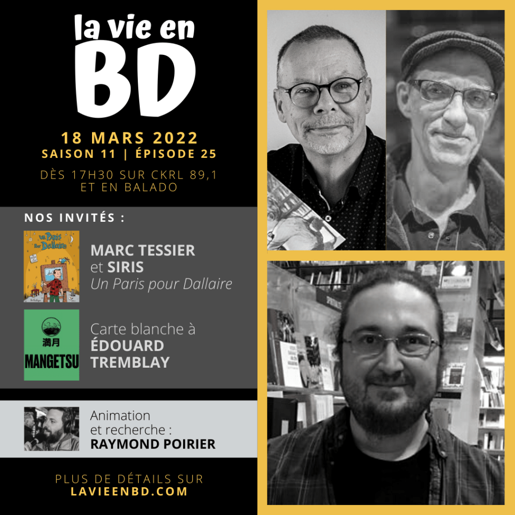 À l’occasion de l’édition du 18 mars 2022 de La vie en BD, notre animateur Raymond Poirier rencontre Marc Tessier et Siris, autour de leur bande dessinée Un Paris pour Dallaire offerte aux Éditions de la Pastèque. Également de passage : Édouard Tremblay, pour une carte blanche qu’il consacre au catalogue des éditions Magetsu. Et plus!