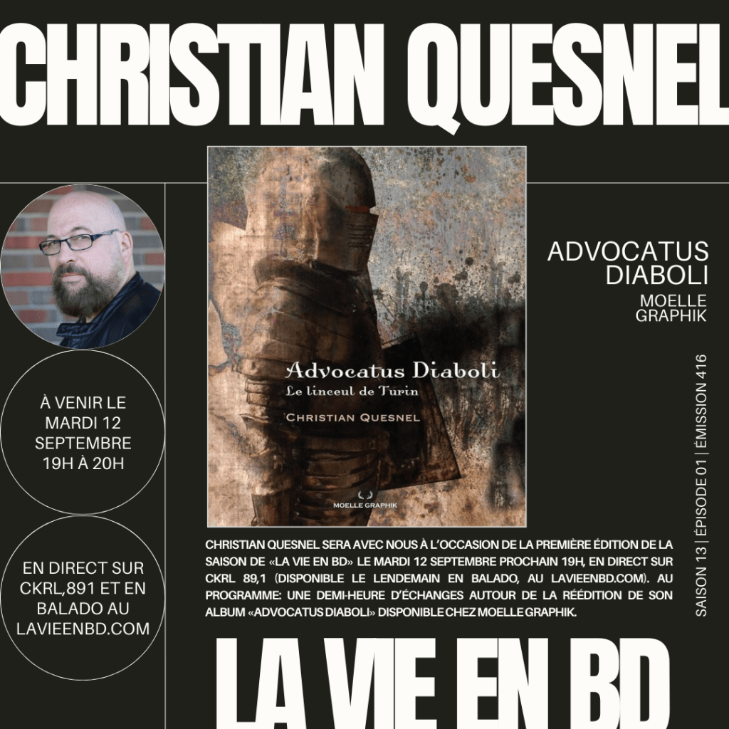 Au mehu de cette 416e émission, notre animateur Raymond Poirier aura le plaisir d’échanger pour une trentaine de minutes avec Christian Quesnel à l’occasion de la réédition de sa bande dessinée Advocatus Diaboli, maintenant disponible chez Moelle Graphik.