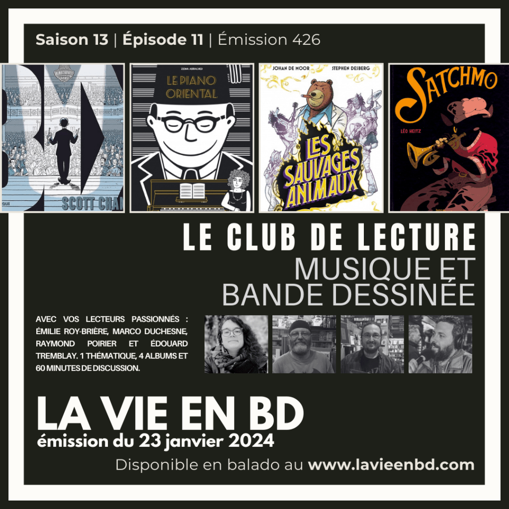 Au Club de lecture de «La vie en BD» : musique et bande dessinée. Les albums discutés: Bix de Scott Chantler (La Pastèque), Le Piano oriental de Zeina Abirached (Casterman), Satchmo de Léo Heinz (Jungle RamDam) et Les sauvages animaux de Johan de Moor et Stephen Desberg (Castemran). Vos lecteurs et lectrice : Émilie Roy-Brière, Marco Duchesne, Édouard Tremblay et Raymond Poirier.