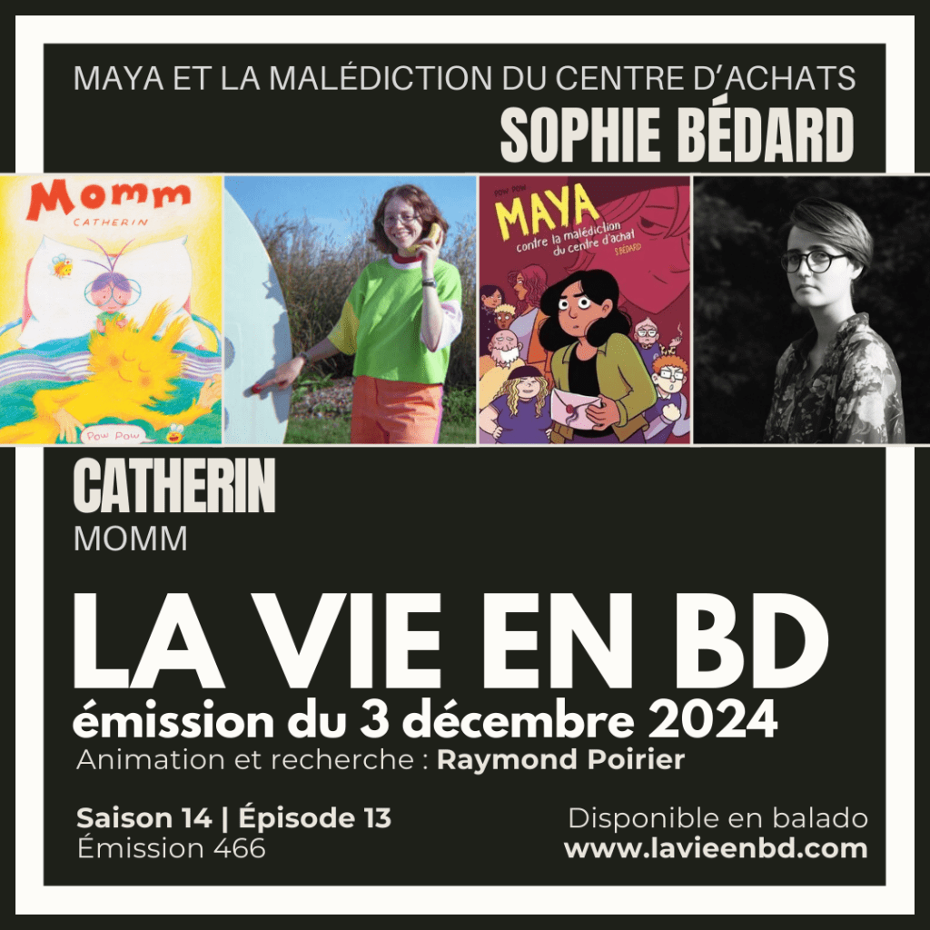 Cette semaine à La vie en BD, notre animateur Raymond Poirier porte un regard sur deux bandes dessinées récemment publiées aux Éditions Pow Pow : Momm, de Catherin, et Maya et la malédiction du centre d’achat de Sophie Bédard, à l’occasion de deux entrevues d’environ trente minutes chacunes.