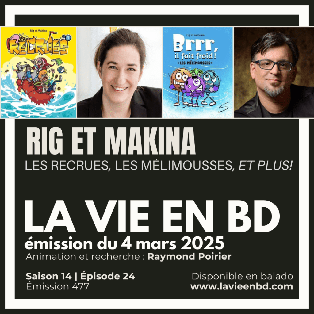 Cette semaine, notre animateur Raymnod Poirier passe une heure avec Rig et Makina, question d’échanger autour de leur production BD jeunesse – tout particulièrement autour de titres tels que Les Recrues (Michel Quintin), Les Mélimousses (Soulières Éditeurs) ou Les vies de Lilo (Z’Ailées).