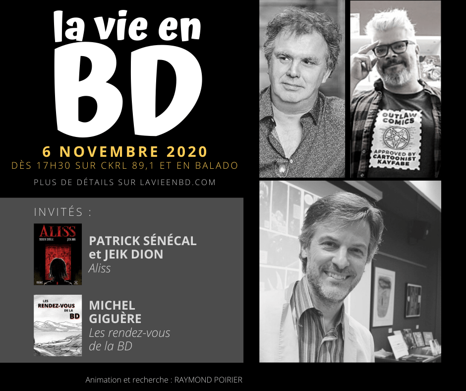 Pour l’édition du 6 novembre 2020 (saison 10 / épisode 09) de La vie en BD, notre animateur Raymond Poirier recevait le dessinateur Jeik Dion et le scénariste Patrick Sénécal pour échanger autour de l’adaptation BD de Aliss (Front Froid / Alire).