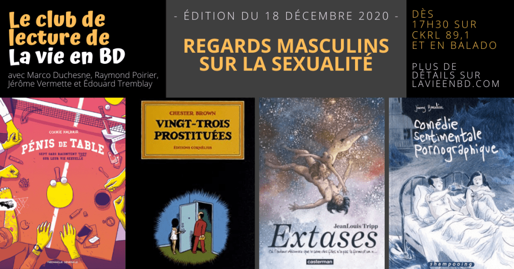 À l’invitation de Raymond, le Club de lecture échangera autour de quatre ouvrages qui, chacun à leur façon, offre un regard sur la sexualité, des tabous aux fantasmes, du sentiment amoureux à l’exploration sexuelle : Pénis de table, de Cookie Kalkair (Mécanique générale), 23 prostitués, de Chester Brown (Cornélius), Extases T1, de Jean-Louis Tripp (Casterman) et Comédie sentimentale pornographique, de Jimmy Beaulieu (Delcourt).
