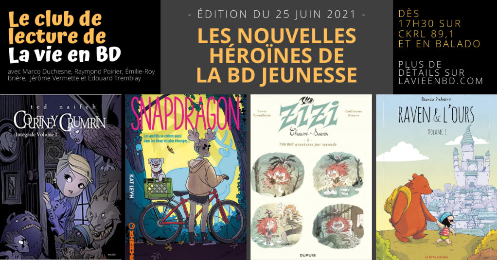 À l’invitation d’Émilie, le Club de lecture échangera autour de quatre albums destinées à un public jeunesse et mettant de l’avant un personnage féminin fort : Courtney Crumpin – Intégrale volume 1, de Ted Naifeh (Akileos), Zizi Chauve-souris T2 : 700 0000 aventures par seconde, de Lewis Trondheim et Guillaume Bianco (Dupuis), Raven & l’ours volume 1, de Bianca Pinheiro (La Boîte à bulles), et Snapdragon, de Kat Leyh (Kinaye).