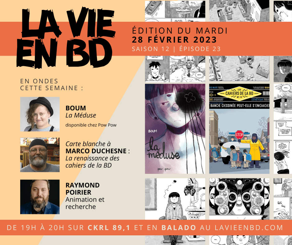 Cette semaine à La vie en BD, notre animateur Raymond Poirier va à la rencontre de Boum, autour de sa bande dessinée La Méduse offerte aux Éditions Pow Pow. Également de passage: Marco Duchesne, pour une carte blanche qu’il consacre à la renaissance des Cahiers de la bande dessinée.