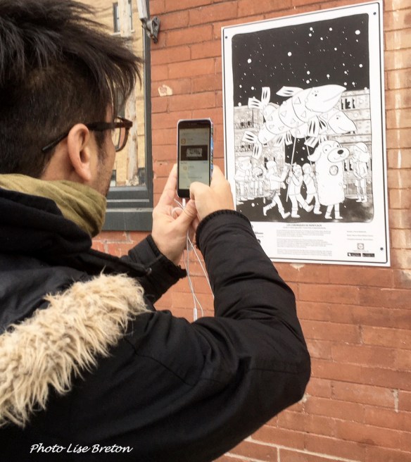 Mais attention! Bien que quelques cases soient visibles à l’œil nu, c’est avec un téléphone intelligent ou une tablette que le public pourra découvrir ces récits scénarisés par Francis Desharnais et dessinés par Bach et Julien Dallaire-Charest du début à la fin, grâce à l’application Cartier BD, disponible gratuitement pour appareils Apple ou Android et réalisée par Benoit Duinat.