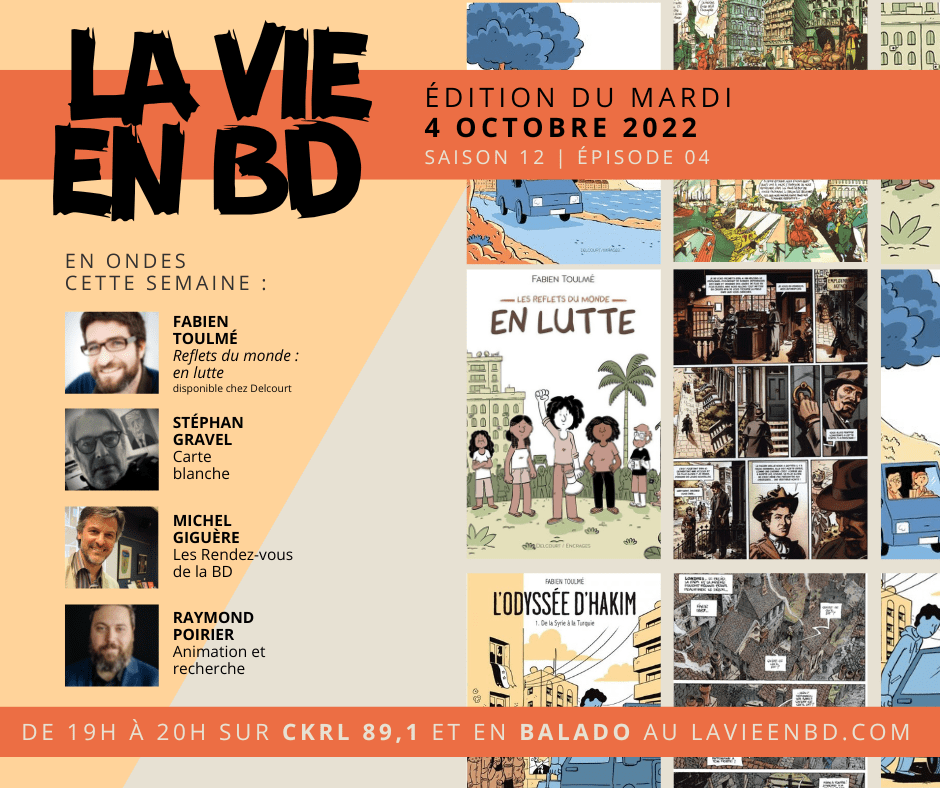 Cette semaine à La vie en BD, notre chroniqueur Stéphan Gravel va à la rencontre de Fabien Toulmé (Reflets du monde: en lutte!, Suzette ou le grand amour, L’odyssée d’Hakim). Michel Giguère met la table pour une prochaine rencontre des Rendez-vous de la BD à la Maison de la littérature consacrée à la Londres du 19e siècle. Également : un regard sur les finalistes du 8e Prix de la critique ACBD de la bande dessinée québécoise.