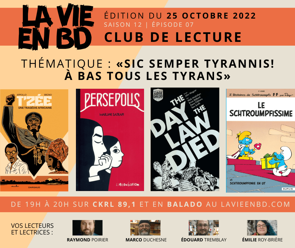 Au programme? Des échanges entre quatre lecteurs et lectrices passionnés de bande dessinée – Marco Duchesne, Émilie Roy-Brière, Raymond Poirier et Edouard Tremblay, autour de quatre titres liés par une même thématique. Ce mois-ci, la thématique, proposée par Édouard, lie dictature et bande dessinée – «Sic semper tyrannis! À bas tous les tyrans».