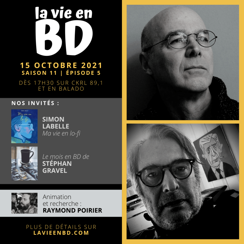 Lors de l’émission du 15 octobre 2021, notre animateur Raymond Poirier a été à la rencontre de l’auteur Simon Labelle, autour de sa bande dessinée Ma vie en lo-fi offerte chez Mécanique générale. Également de passage : Stéphan Gravel pour son mois en BD, où, inspiré par sa lecture de Jours de sable d’Aimée de Jongh (Dargaud), il explore la nature de son intérêt pour la bande dessinée et ses habitudes de lecture.